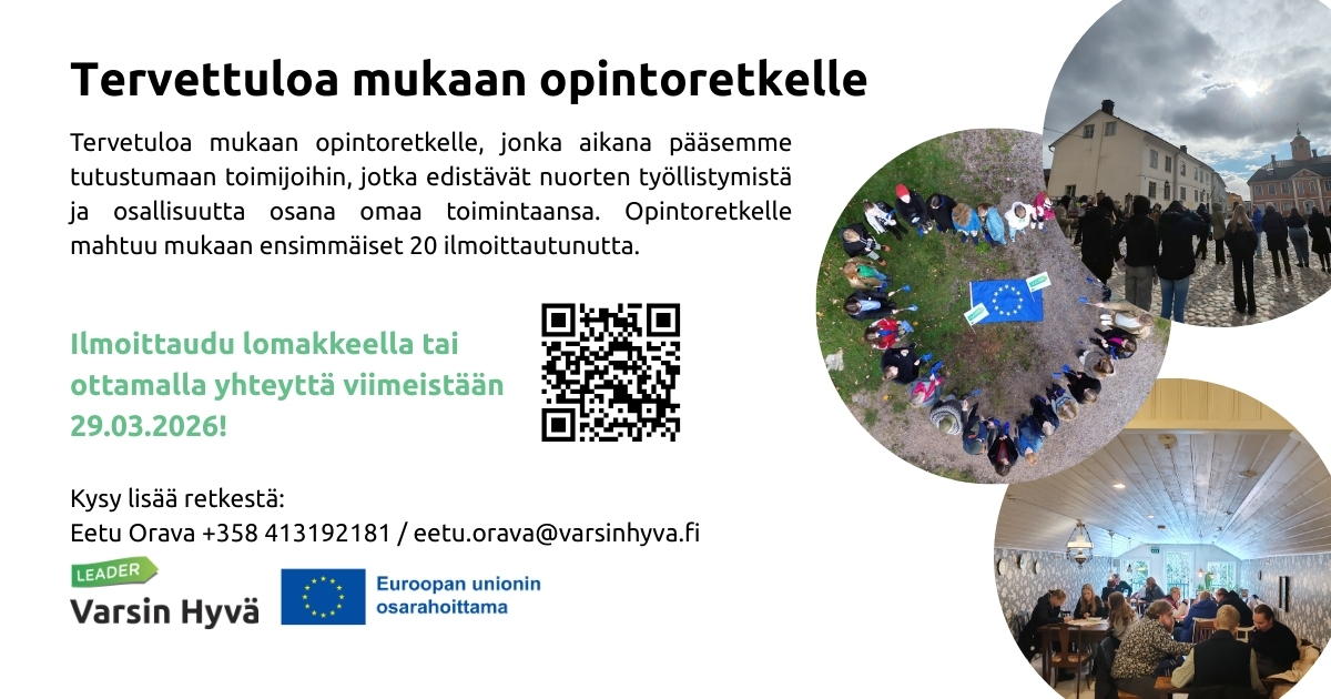 Tervetuloa mukaan opintoretkelle, jonka aikana pääsemme tutustumaan toimijoihin, jotka edistävät nuorten työllistymistä ja osallisuutta osana omaa toimintaansa. Opintoretkelle mahtuu mukaan ensimmäiset 20 ilmoittautunutta. https://forms.cloud.microsoft/e/1tKwg9rX1t